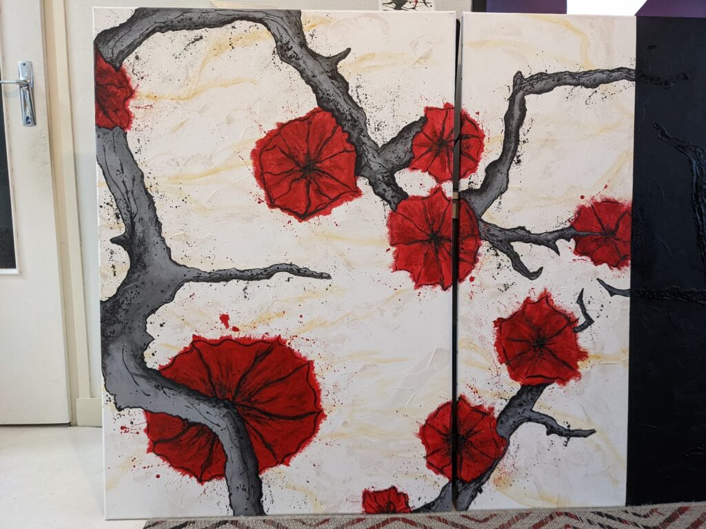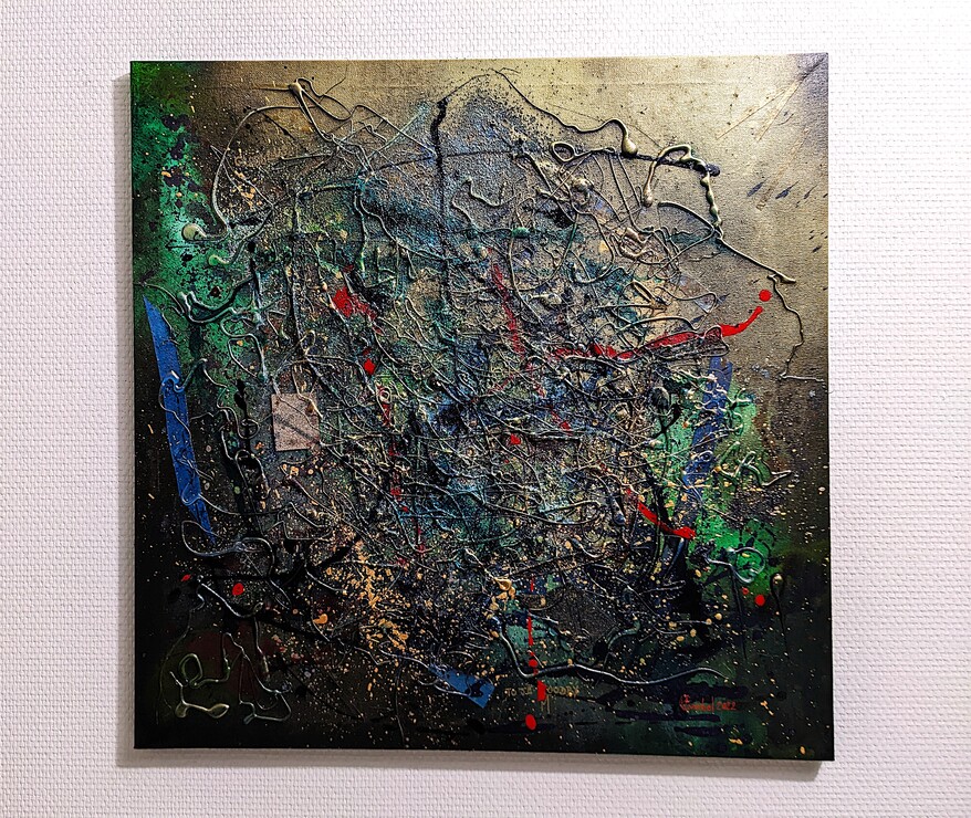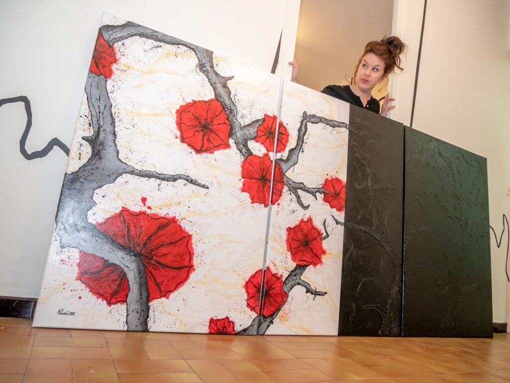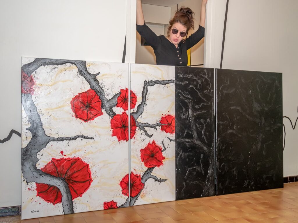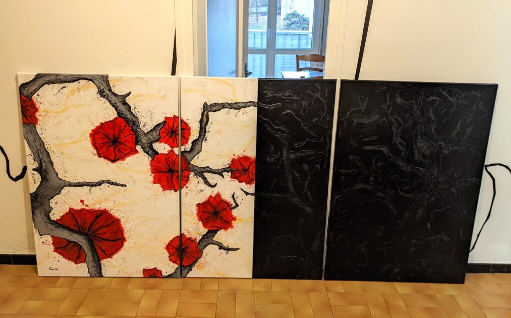 Un triptyque de 90 x 130 cm peint à l’acrylique et mis en relief au gel durcisseur, réalisé pour habiller les murs de la salle municipale de la mairie de la Motte-Servolex.