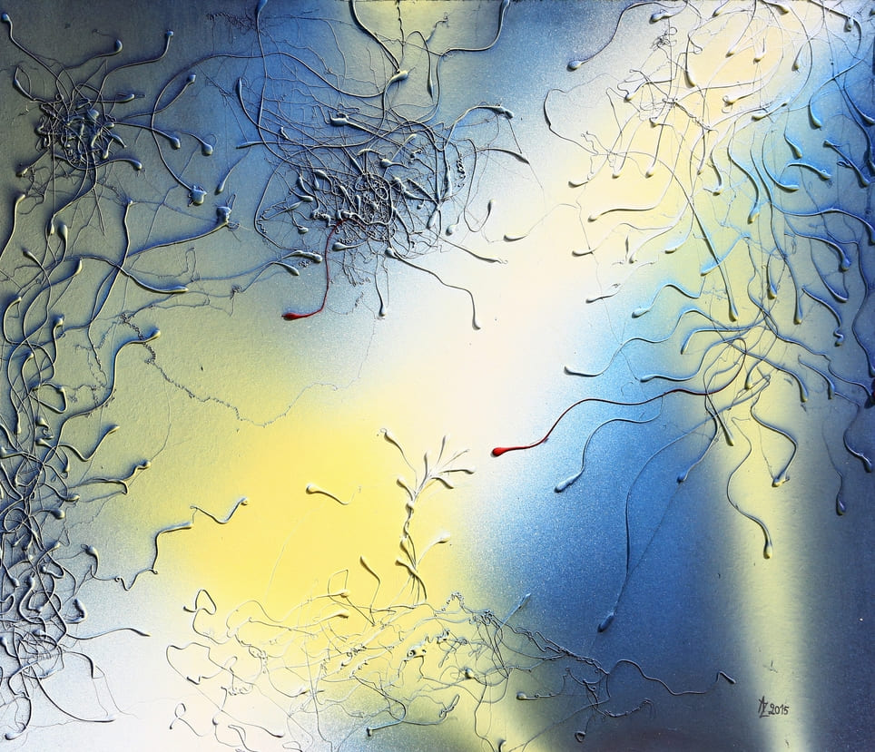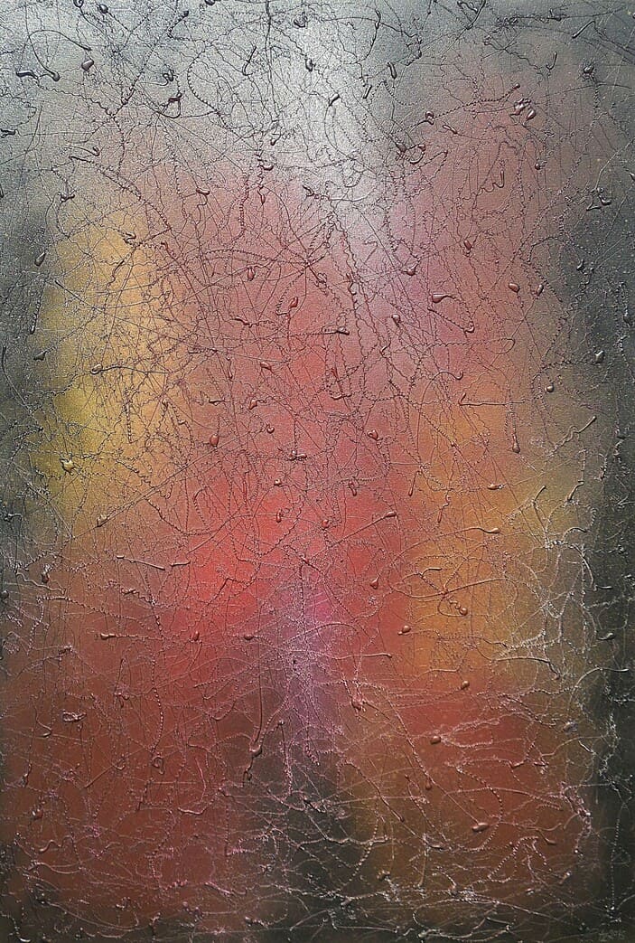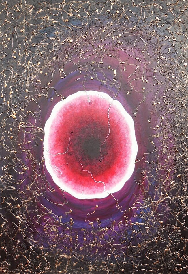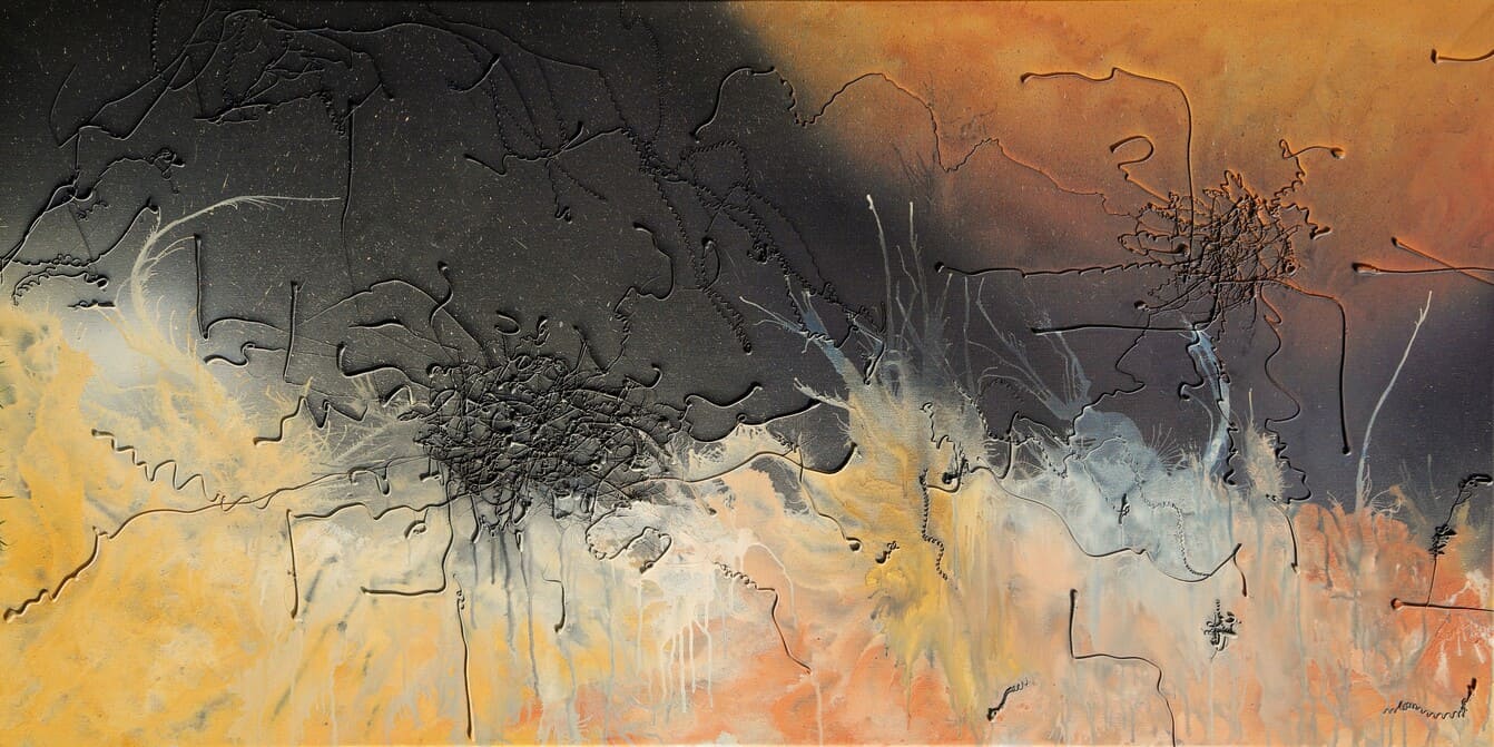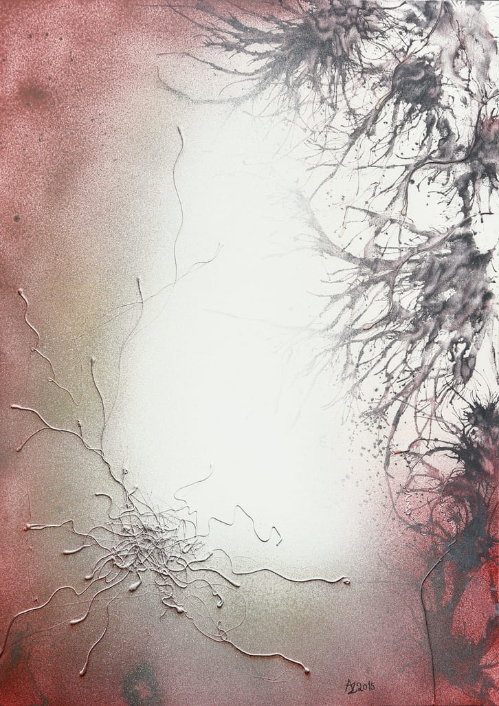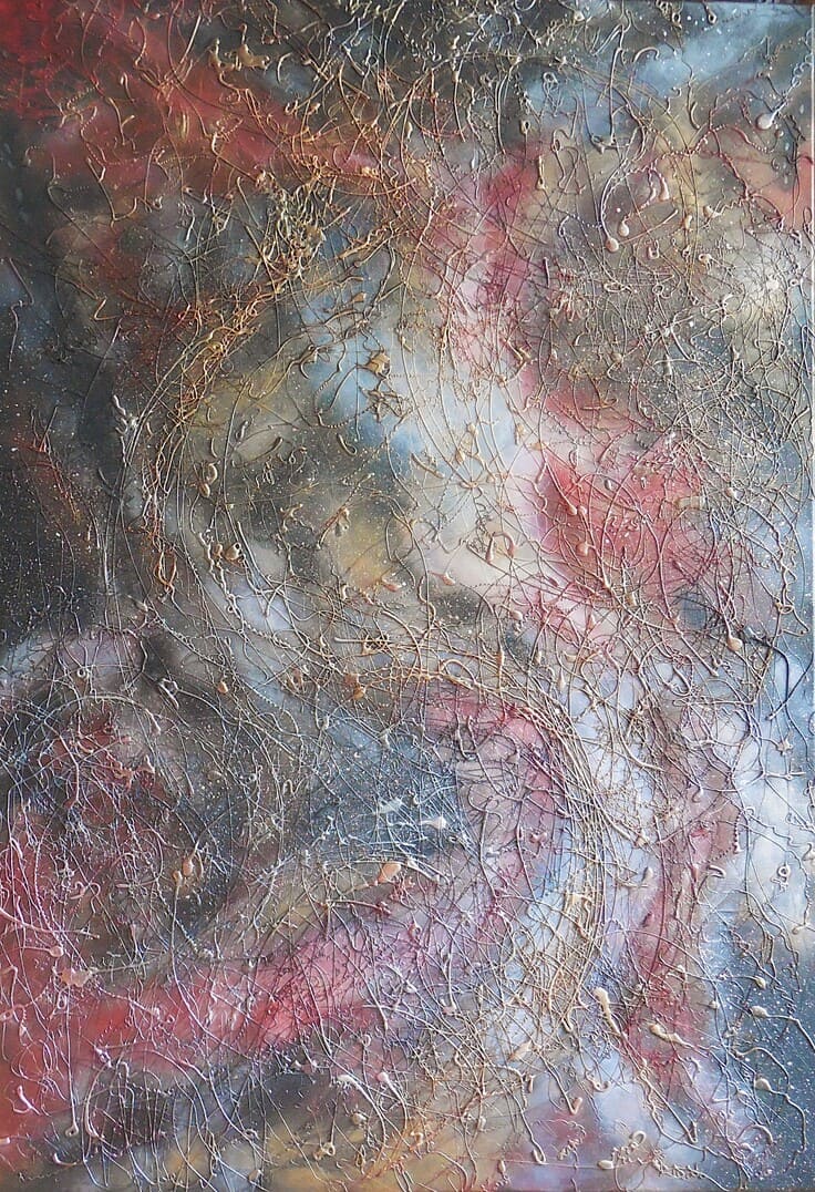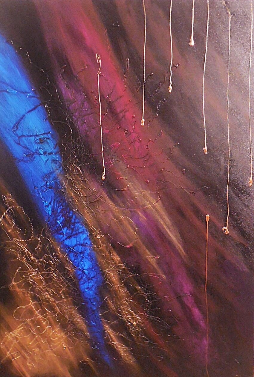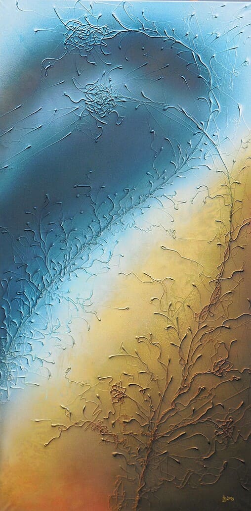 Dans un genre abstrait, on découvre des proliférations, réseaux, ramifications, veines, nœuds, tensions. Cela donne au support des reliefs presque vivants. L’acrylique, appliquée par couches successives, vient les colorer et les transformer en textures animées.