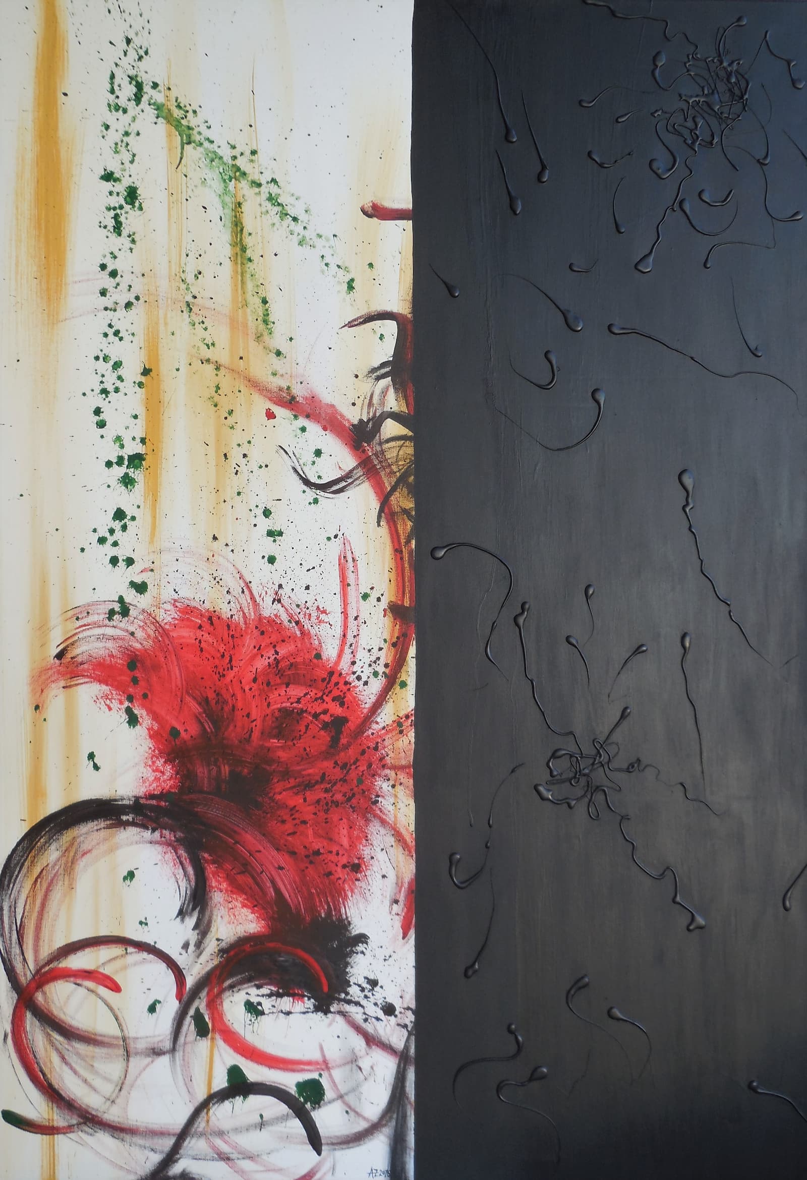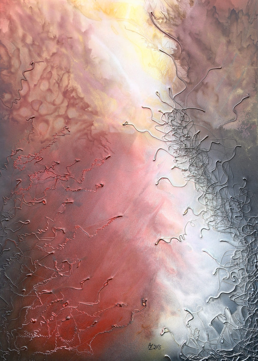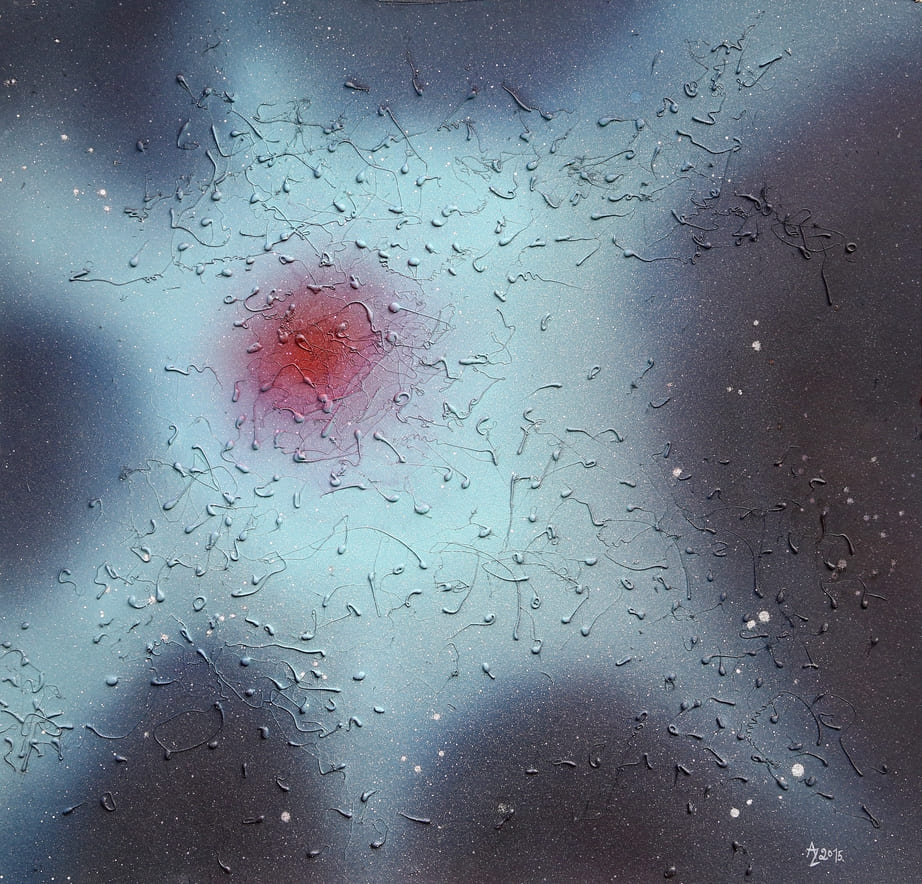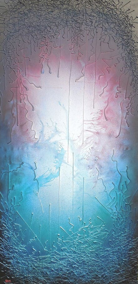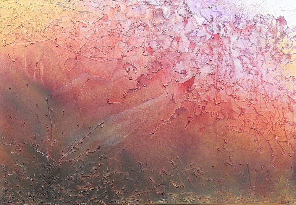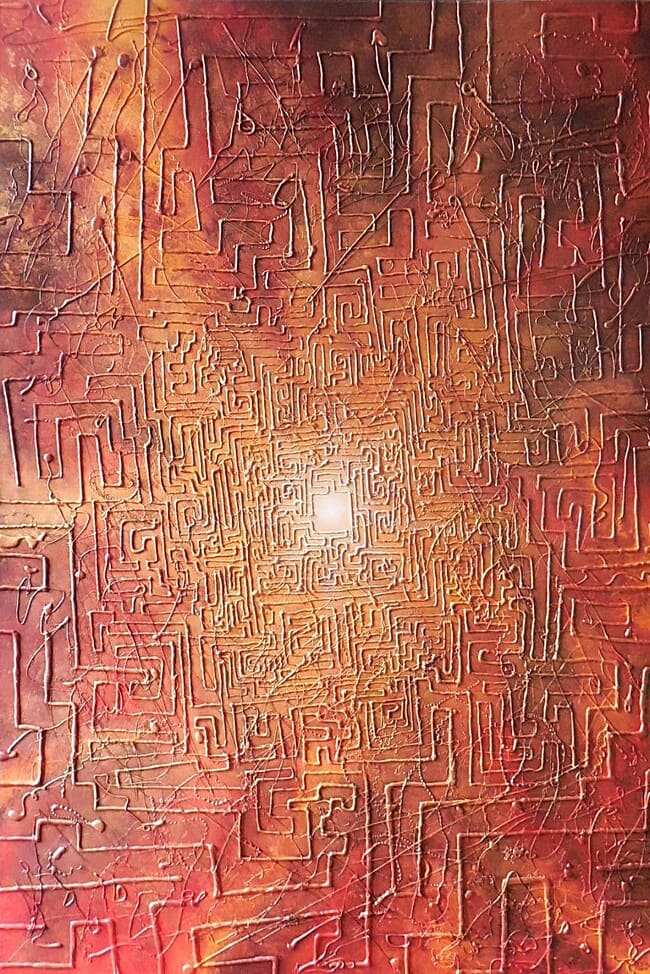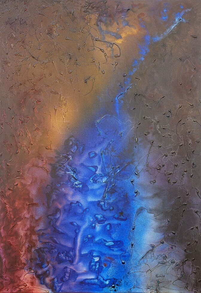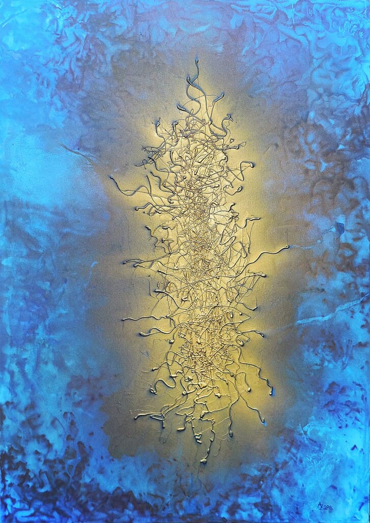 Dans un genre abstrait, on découvre des proliférations, réseaux, ramifications, veines, nœuds, tensions. Cela donne au support des reliefs presque vivants. L’acrylique, appliquée par couches successives, vient les colorer et les transformer en textures animées.